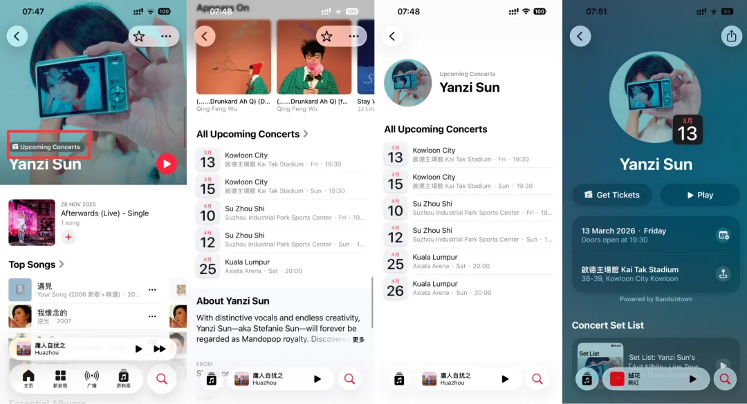 如果艺人的页面上带有「Upcoming Concerts」标签,下滑可以看到他/她接下来的数场演唱会日期和地点。