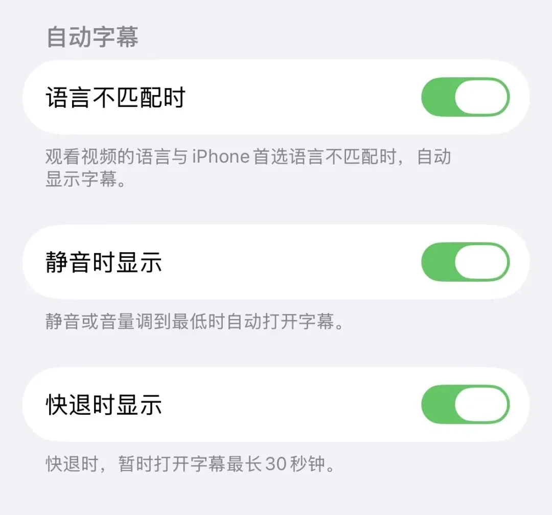 12、新增了「辅助功能 - 字幕与隐藏式字幕」中「语言不匹配时」和「静音时显示」两个选项。