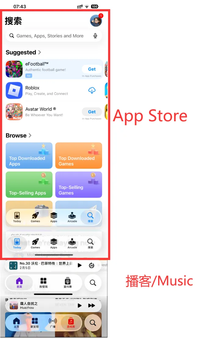 22、调整了 App Store、播客、Apple Music 个人信息页面的标题栏,统一使用彩色图标+左对齐的形式。