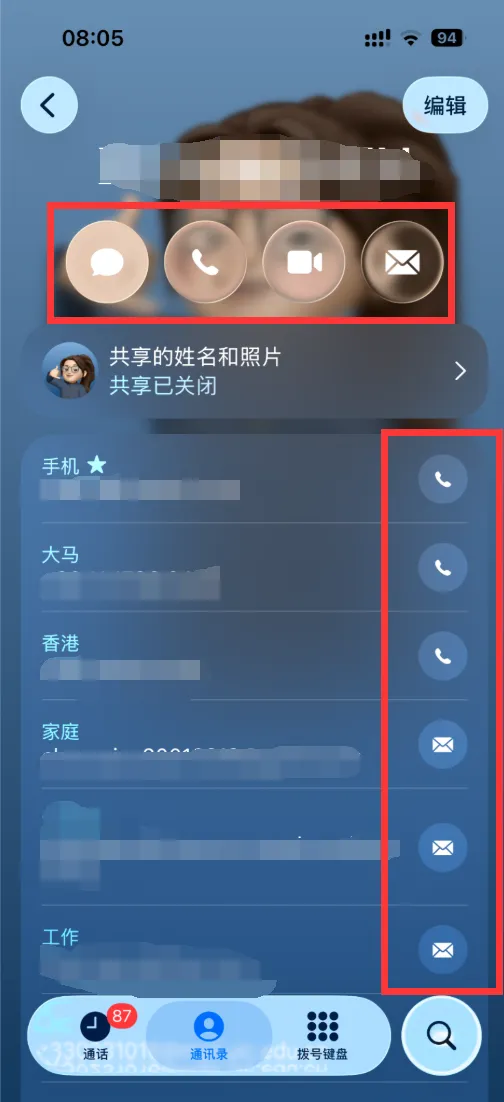 18、调整了通讯录的拨号等按钮为 Liquid Glass 风格。