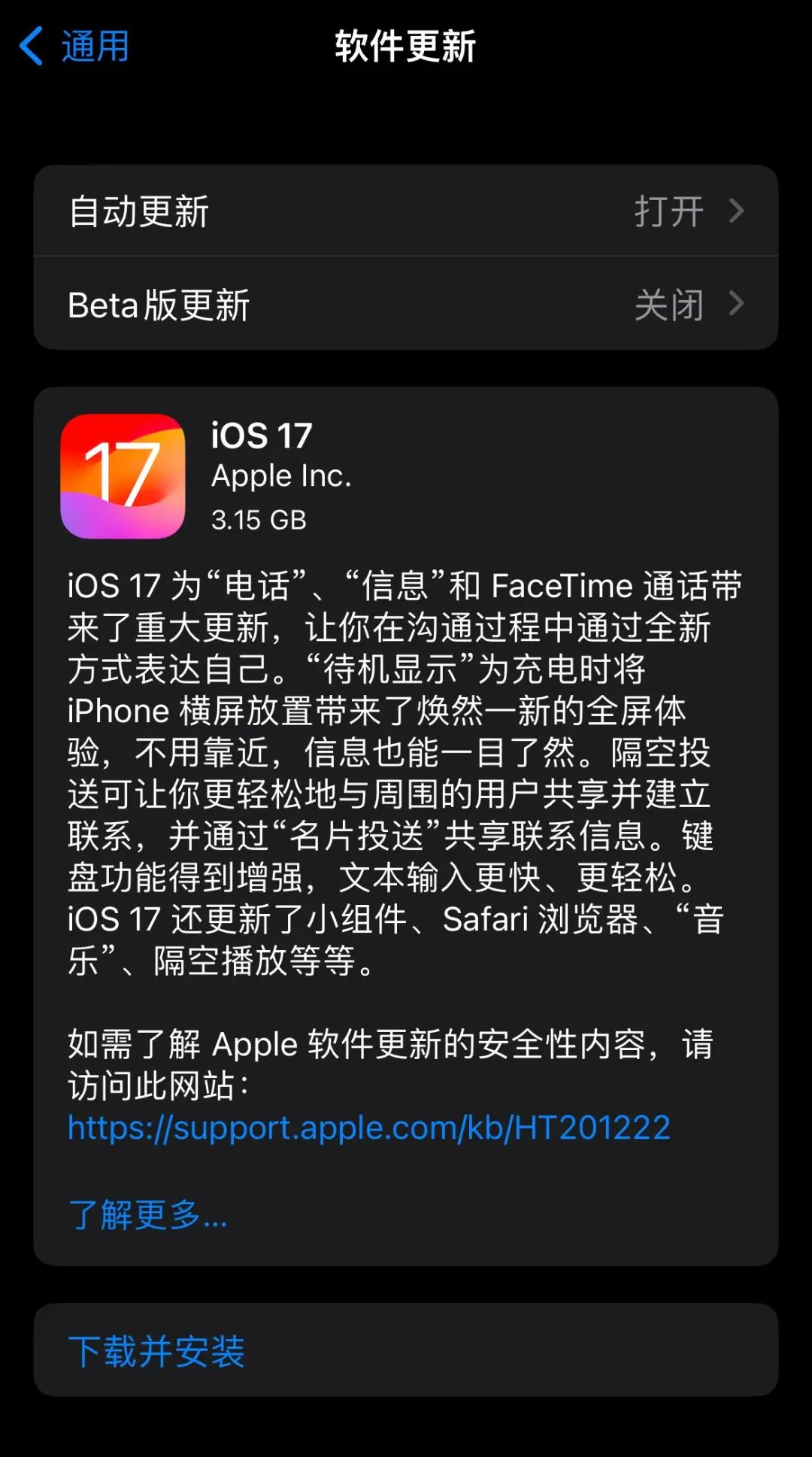 1、直接在设置 - 软件更新中安装推送,点击「下载并安装」即可。