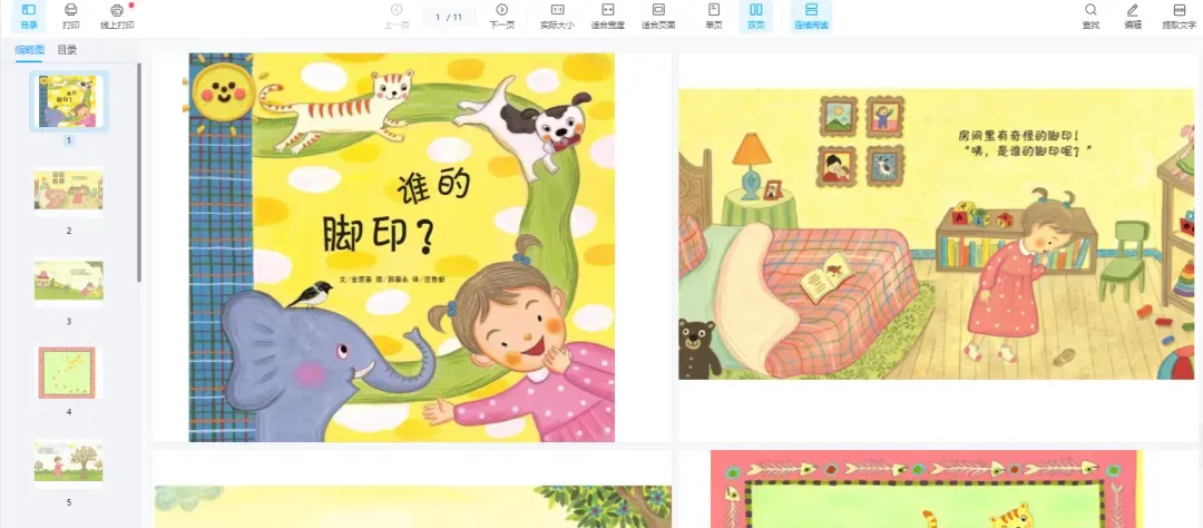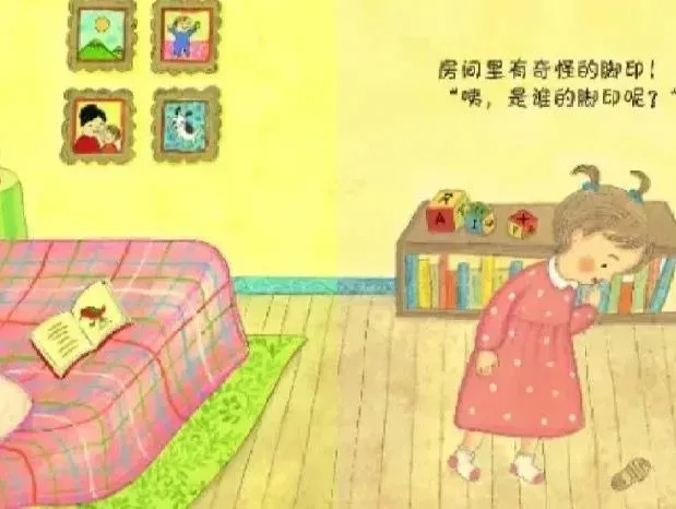 《谁的脚印》,这本绘本讲述了一个有趣又带有神秘色彩的故事。小女孩在房间里发现了一个长长的脚印,为了知道是谁的脚印,它问了小花猫、小麻雀、大象……可是它们都说不是自己的脚印,那,这个脚印到底是谁的呢?