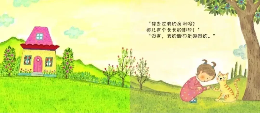 “小猫咪,你去过我的房间吗? 那儿有个长长的脚印!”“没有,我的脚印是圆圆的。”