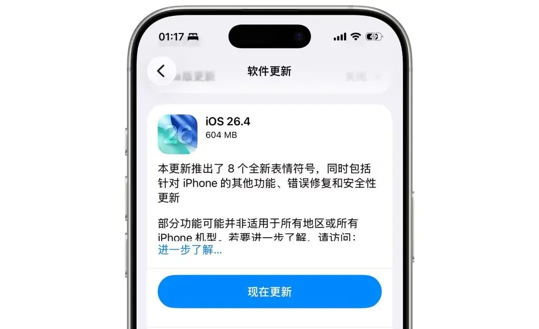 2026年3月25日凌晨,iOS 26.4开始往iPhone上推送,版本号23E246,这一轮像一次春季功能补给,装上去能看到不少新东西,系统级Apple Intelligence这件事,中国用户这边还是没见到,页面里那句“于中国大陆购买的设备无法使用”还在,传说这版要带上来的说法没有落地,境外买的机器只要Apple ID在中国大陆也不开,节奏被按住了。