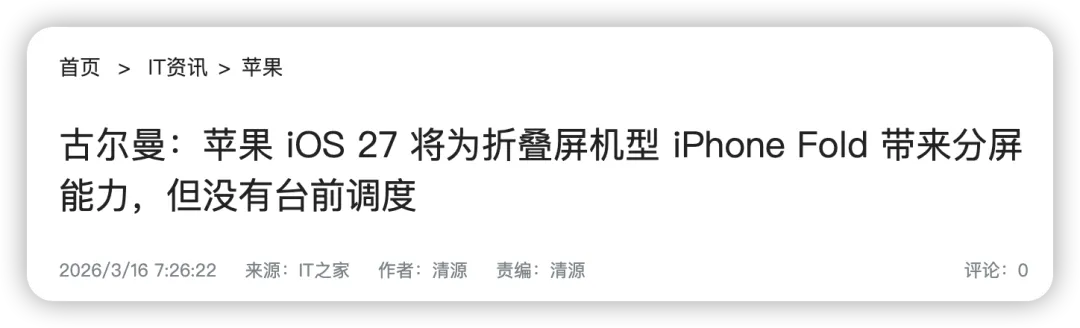 那就是为配合即将推出的折叠屏 iPhone,苹果正在为 iOS 27 进行重要调整。