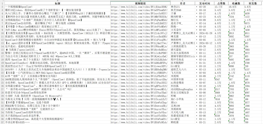B站指定关键词笔记采集效果: