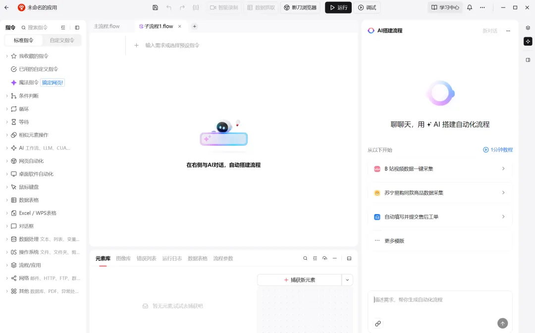 下载影刀后,左上角新建 -> PC自动化应用 -> AI对话搭建。