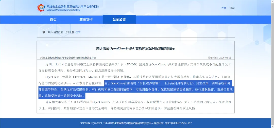 首先是安全风险。不久前,工业和信息化部网络安全威胁和漏洞信息共享平台(NVDB)公开发文,提醒相关单位防范OpenClaw的安全风险。