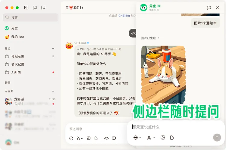 即可在侧边栏找到元宝派 👇