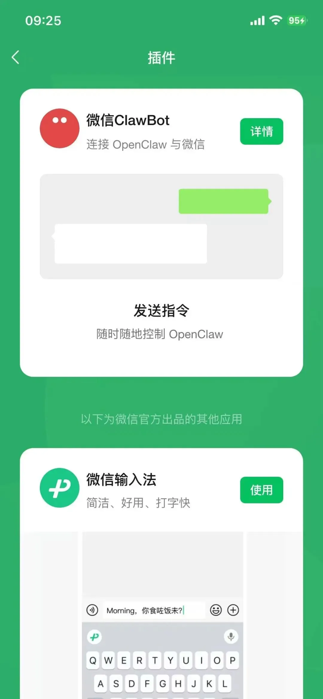 微信必须更新到最新版,旧版本没有插件入口 OpenClaw 要先安装好,这个教程不教怎么装 OpenClaw(网上有很多教程) 机器要保持在线,AI 助手才能 24 小时响应