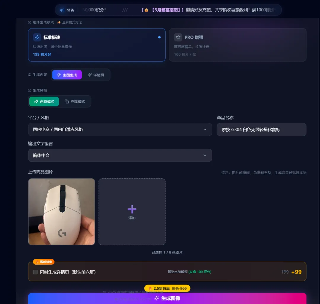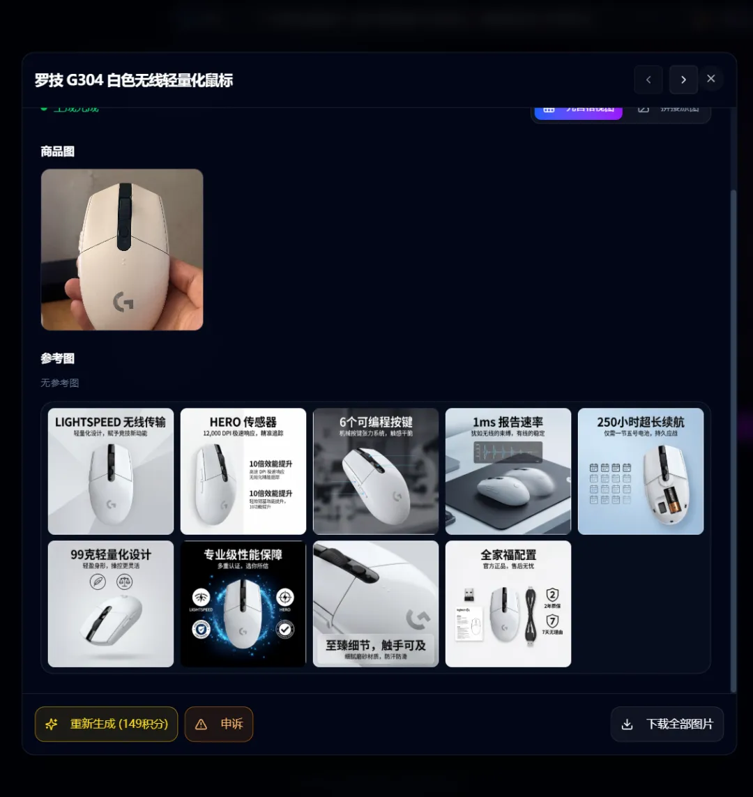这次我就拿电商爆款、大家都熟悉的罗技 G304 白色款电竞鼠标为例,给大家走一遍完整的生成流程,全程不用打开任何修图软件,手残党也能一次成功