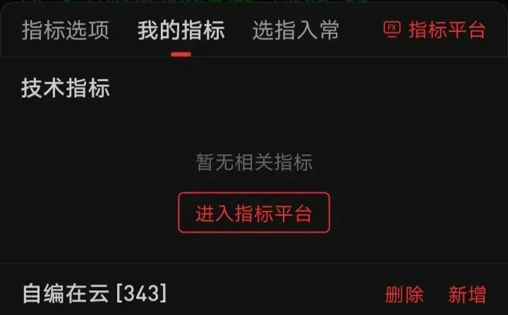 在下方副图区域(MACD等位置),点击左上角指标名称 → 选择「我的指标」 → 点击右下角新增。