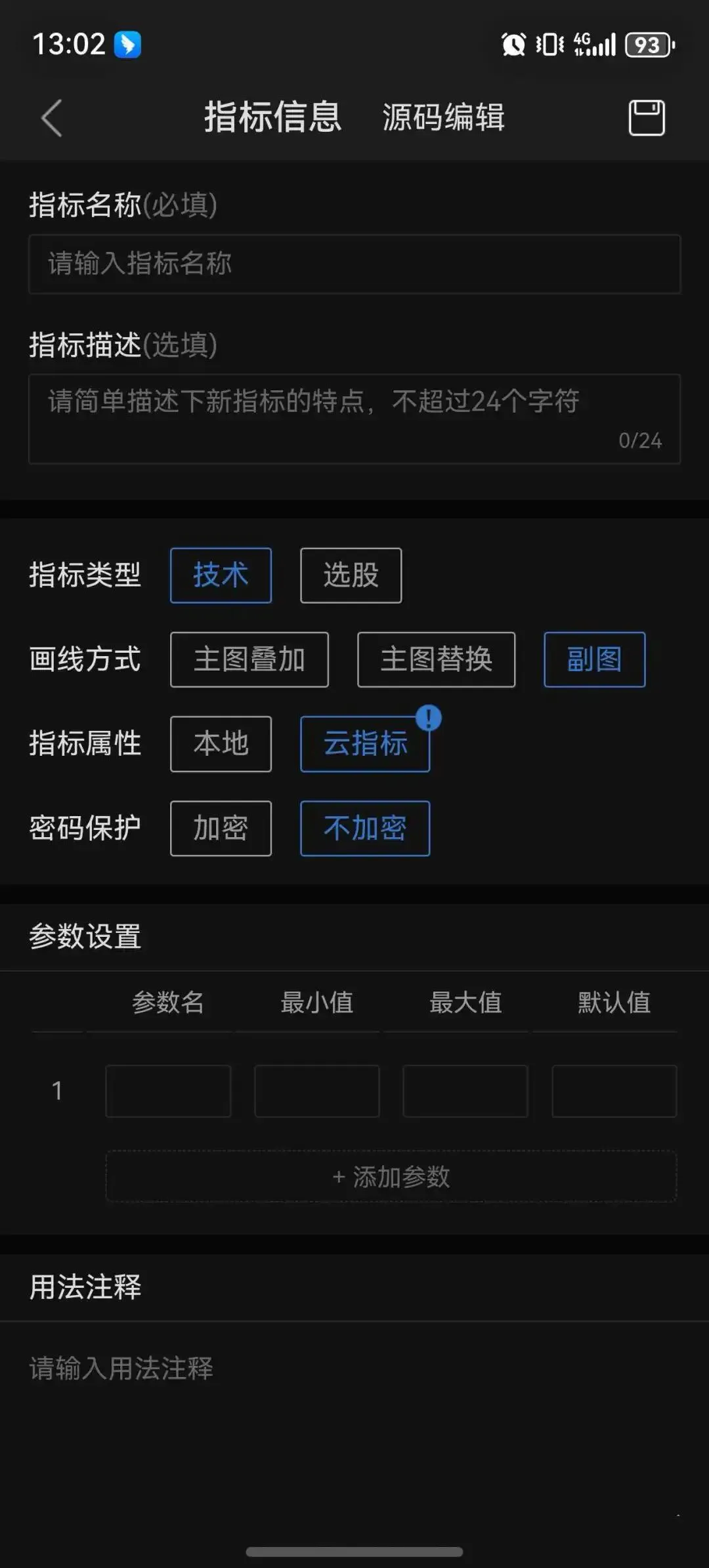 点击「源码编辑」,把完整的指标公式代码粘贴进去。