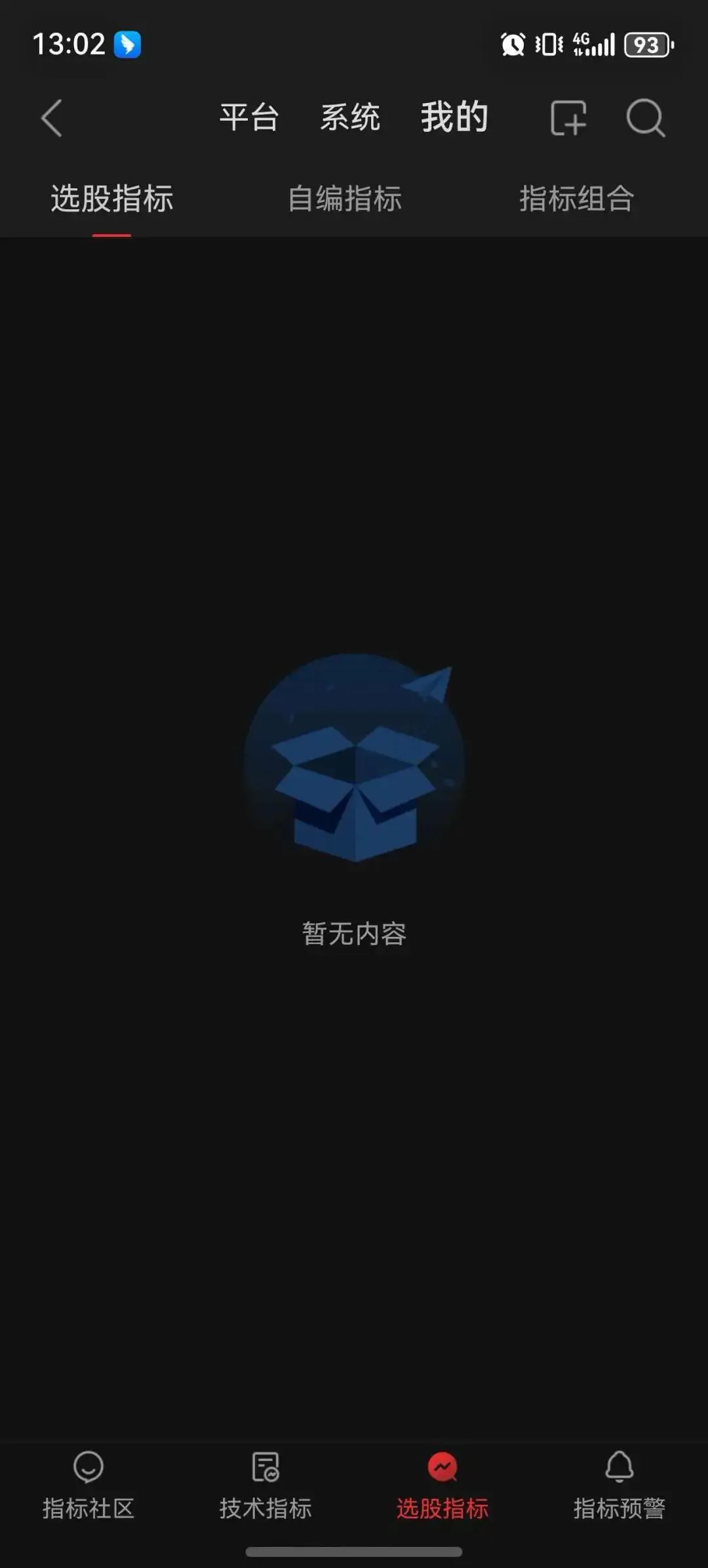 首页 → 指标平台 → 底部切换「选股指标」 → 右上角「我的」 → 点“+”新建。