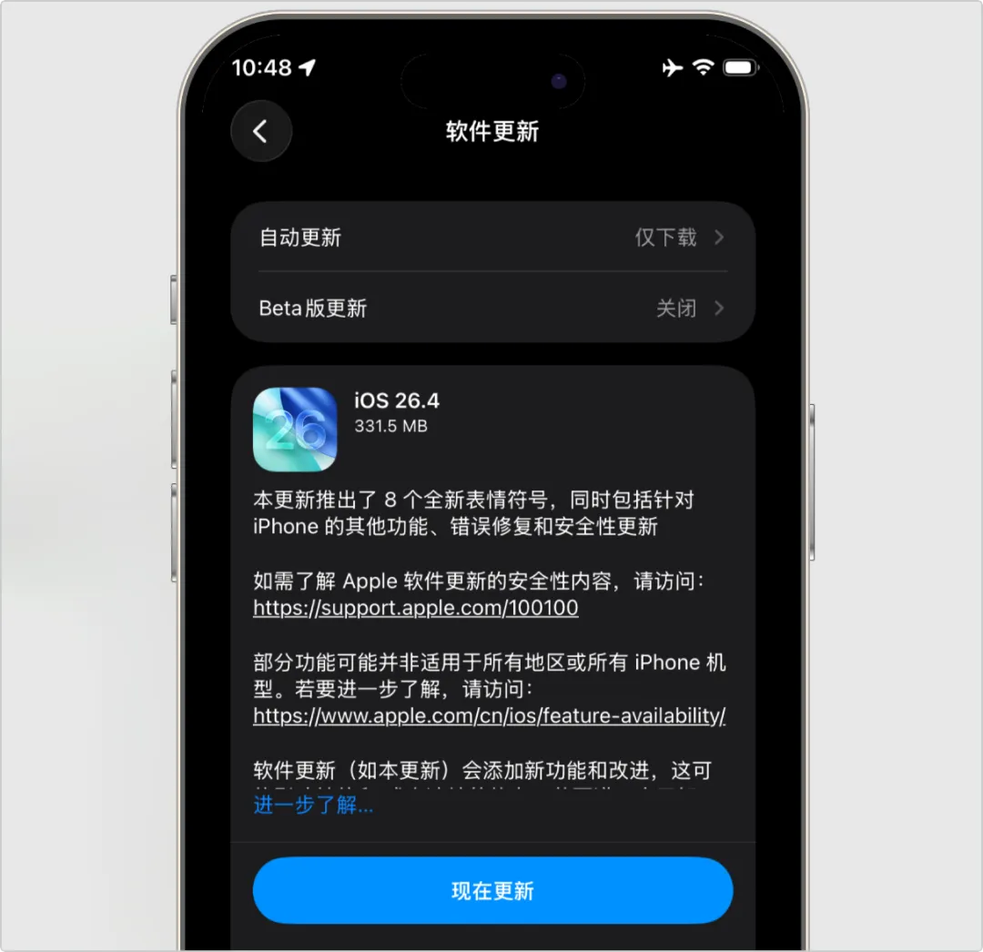 今天,苹果发布了 iOS26.4 正式版,版本号为23E246 ,高于RC版,所以RC版用户可以再次升级到正式版