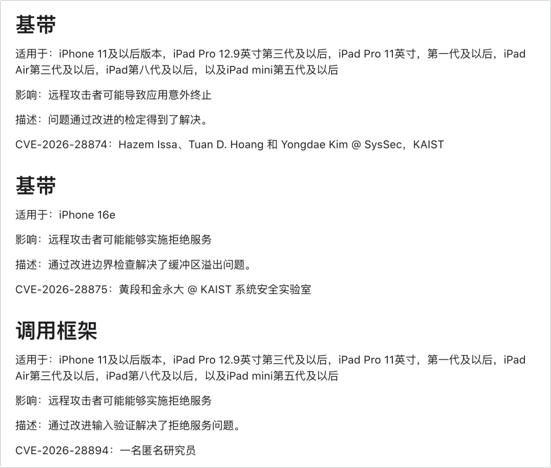 查询苹果安全文档,iOS26.4 修复了多达 34 个漏洞,其中包括4个核心级别的漏洞,并首次出现了基带芯片的漏洞