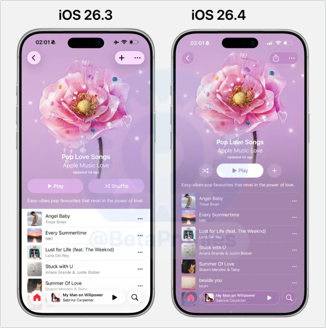 苹果称在 iOS26.4 上,提升了打字时键盘识别的精确度在设置-辅助功能-显示与文字大小中,新增了“减弱明亮效果”选项,开启后,可以减少屏幕元素交互时的高亮显示,避免刺激眼睛苹果自带的提醒事项App,新增“紧急”项目,如果把某个事项设置为紧急,默认带有闹钟提醒在 Applemusic 的播放列表页面,底色与专辑背景图融为一体,不同播放列表的颜色会随专辑背景图而改变新增可以根据 AI 提示,自动创建播放列表,AI会根据你的想法给列表里增加25首歌曲(国行还不可以用)Apple Music 现在还会显示附近的音乐会,如果你听的歌曲作者正好有音乐会,就会显示在作者的主页(暂时只在部分国家上线)苹果音乐新增“环境音乐”小组件,并且可以把组件添加到 CarPlay 车机屏幕上新增8个emoji表情包,其中,这个大眼睛emoji受到不少人喜爱在系统设置-墙纸中,现在自带壁纸默认不保存在本地,需要点击获取才能下载到本机上,可以减少壁纸对空间的占用在 iPhone 桌面屏幕长按呼出“编辑”菜单后,该菜单升级为“液态玻璃”效果在深色模式下,控制中心长按弹出的菜单,调整为黑色液态玻璃