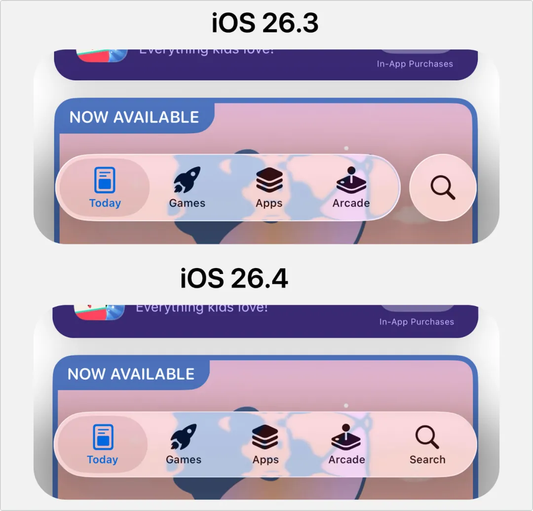 苹果宣布,从iOS26.4开始,在播客中加入视频功能,现在除了可以听播客,也可以看播客无边记App内部功能细节也进行了多项改动,不过,这个App国内用的人不多在 App Store 和 Apple Music 的账户中心里,用户名调整为左对齐,并统一换上了与系统设置中相同的彩虹色苹果 Logo以后这种小标题左对齐的样式,将会在 iOS26 和 iOS27 上全面应用通讯录中,联系人头像新增了 - 删除按钮,可以删除联系人照片和头像在AppStore中,搜索按钮和底部菜单Tab集成在一起AppStore的搜索栏,从底部被移动到了屏幕顶部在safari浏览器右上角新增一个长期悬浮的搜索按钮在iOS系统设置-相机-录音设置中,新增了一个 音频缩放 的开关,开启之后录制视频时,会自动把声音聚焦到主体身上总体来看,iOS 26.4 正式版带来的更新非常多,不仅包括功能的更新,还有大量细节的优化,量大管饱,值得好评关于系统流畅度方面还有待验证,大家可以留言说说自己机型的升级体验下期给大家带来各机型的耗电实测以及升级建议,咱们下期见~