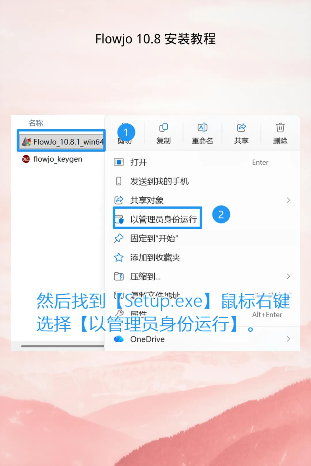 1. 管理员运行:打开解压后的FlowJo_10.8.1_win64文件夹,右键Setup.exe选择【以管理员身份运行】。