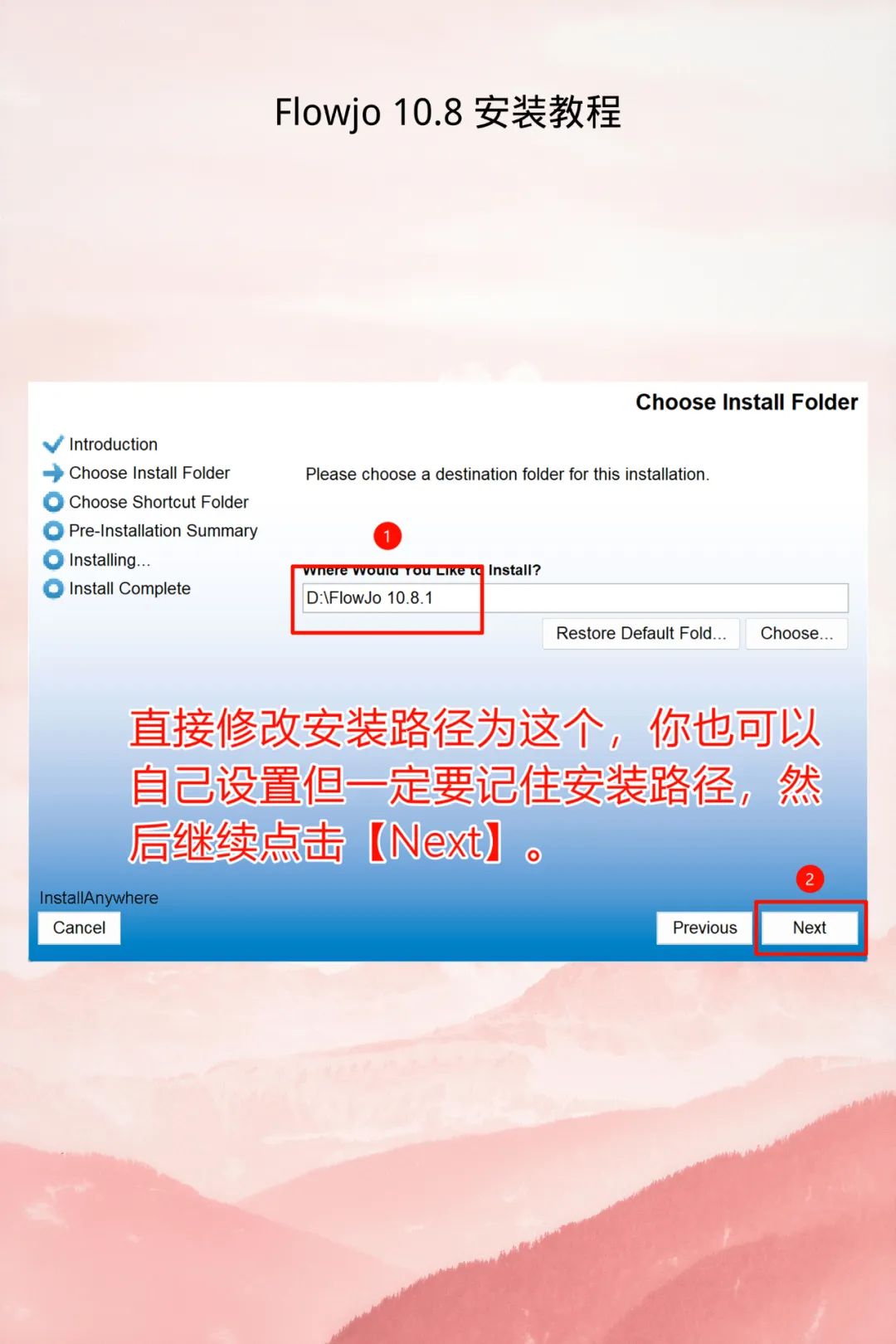 2. 路径自定义:在安装界面点击修改路径。推荐位置:D:\FlowJo 10.8.1。点击 Next 继续。