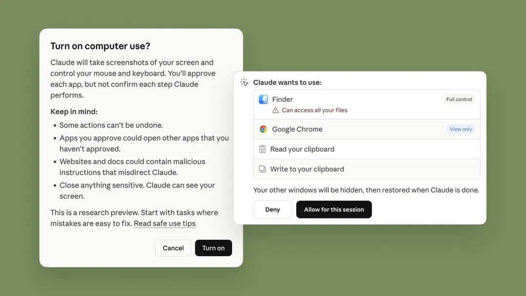 在执行逻辑上,Claude 会优先使用 Slack 或 Google Calendar 等现有连接器;若无现成连接器,则会请求权限后通过控制鼠标、键盘和屏幕来完成任务。
