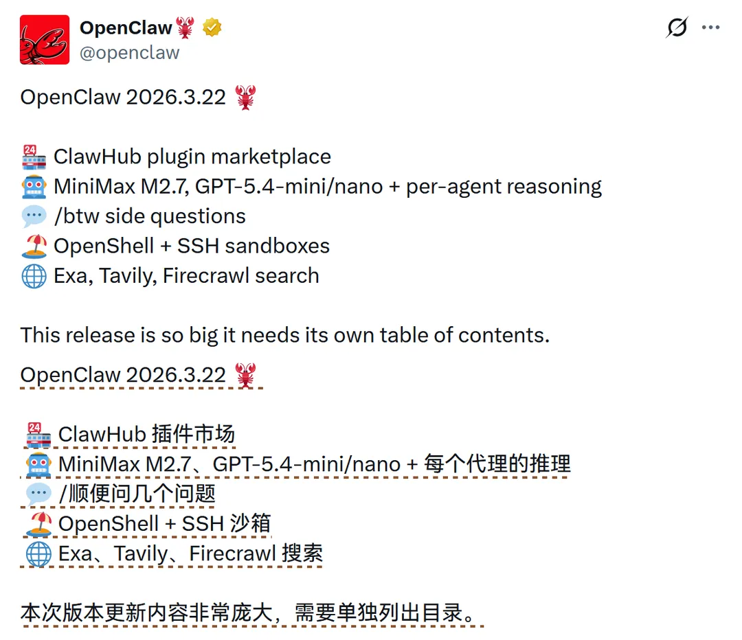 2026.3.22 版本作为一次重大更新,正式推出了 ClawHub 插件市场,并新增了对 MiniMax M2.7、GPT-5.4-mini/nano 模型的支持,同时引入了 per-agent reasoning 推理功能、/btw 侧边提问、OpenShell 与 SSH 沙箱,以及 Exa、Tavily、Firecrawl 等多项搜索集成。