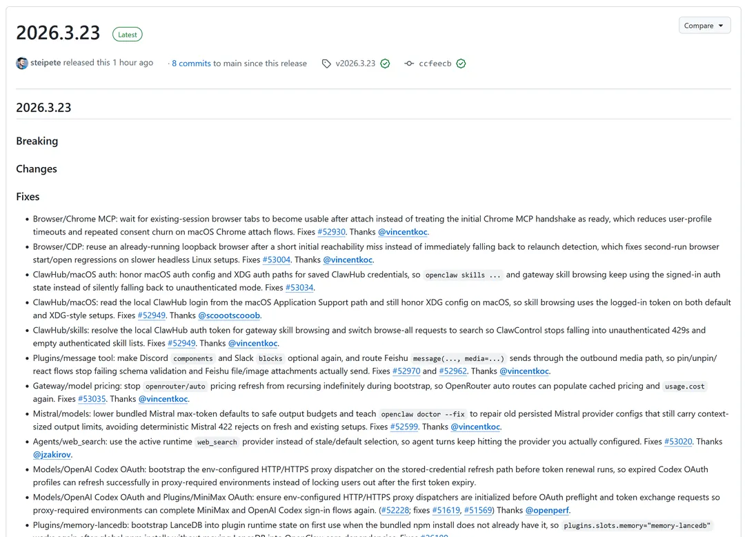 OpenClaw 近日连续发布了 2026.3.22 与 2026.3.23 两个重要版本。