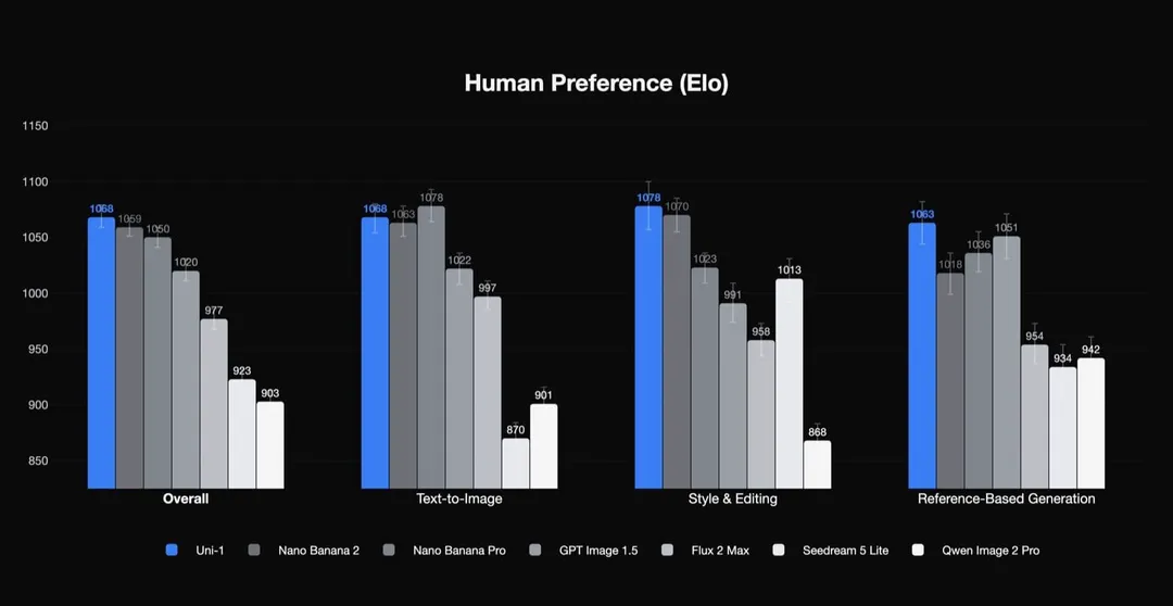 根据官方提供的数据,Uni-1 在 RISEBench 推理基准测试中达到了最先进(SOTA)水平,并在人类偏好 Elo 评测中的总评、风格与编辑以及参考生成类别中排名第一。