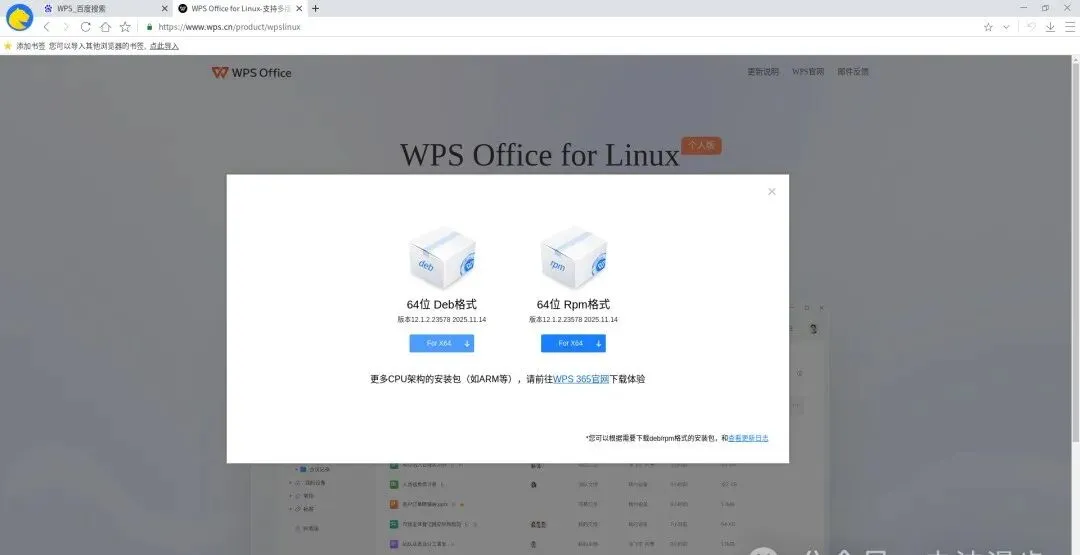 在 WPS 官网找到【更多下载】-【Linux版】,下载【64位 Deb格式】。