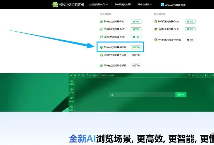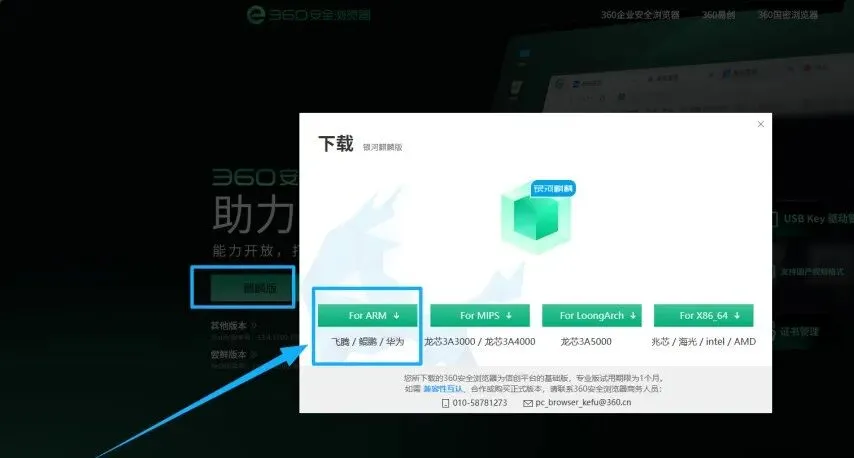 进入360安全浏览器官网,点击上方的【全部浏览器产品】,点击【信创版】,选择【麒麟版】中的【For ARM】版本下载。