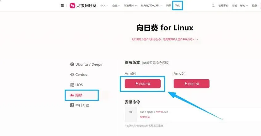 点击软件首页上方【下载】,选择【麒麟】目录下的【Arm64】版本下载。
