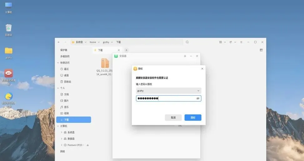 如果你是最新的麒麟V10 SP1 2503版本,可以直接点击运行下载好的.deb格式的安装包,弹出安装界面后,输入电脑的开机密码即进行安装。