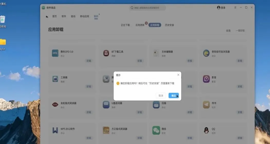 打开【软件商店】,找到【我的】-【应用卸载】,点击需要卸载软件旁边的【卸载】即可完成软件卸载。