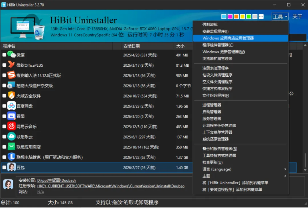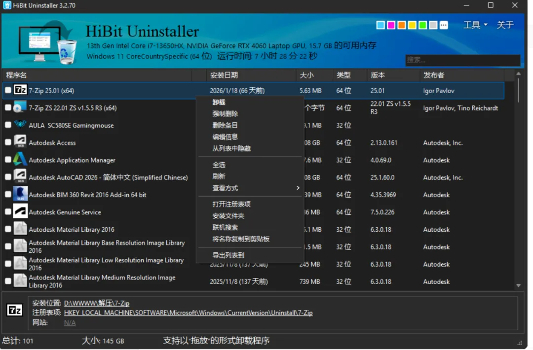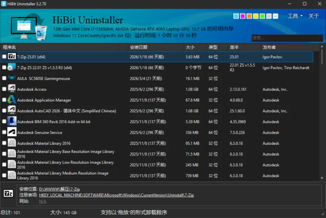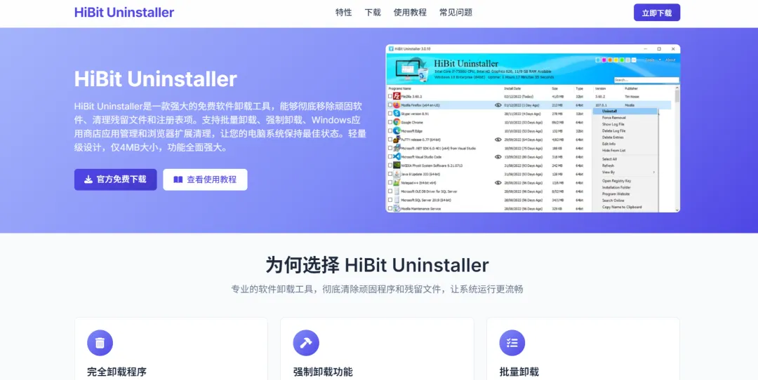 强制卸载!删除残留!这款免费卸载工具完美解决纨绔软件!!!相信大家在平日里安装各类软件,不用之后卸载起来却很麻烦。而且电脑用久了,许多软件卸载不干净,残留一堆垃圾文件,导致电脑越来越卡,甚至还有些删除不掉的流氓软件。然而系统自带的卸载功能,往往只能删除主程序,文件夹、注册表、缓存文件还全部保存在电脑里面,久而久之不仅占用空间,还容易报错、弹窗。今天就给大家分享一款非常好用的卸载软件——HiBit。一、下载方式1.浏览器搜索【Hibit】,或者直接复制下面的官网跳转下载。官网:https://www.hibituninstaller.cn/这是一个轻量级软件,仅仅只有4MB。2.下载后,直接双击文件一直默认点击【下一步】,直至安装完成即可。二、使用方法1.这是HiBit的界面,非常干净整洁。2.启动程序,它会自动扫描你电脑安装的所有文件;若有需要卸载的软件,直接右键卸载即可,也可批量卸载。3.点击【启动】,开始卸载。4.卸载后,点击【扫描】5.然后它会找出该文件的所有剩余痕迹和垃圾(如果确定不需要了,把下方【创建备份】取消勾选,再清除。)另外,这款软件也可以卸载一些Windows自带的软件。6.其他功能这款软件还带有许多功能,比如:【注册表清理】、【垃圾文件清理】、【空文件夹清理】很难想象到它仅仅只有4MB大小。HiBit作为一款免费、全功能、无捆绑的卸载软件,属于普通人的首选。关注我,分享更多免费宝藏资源。