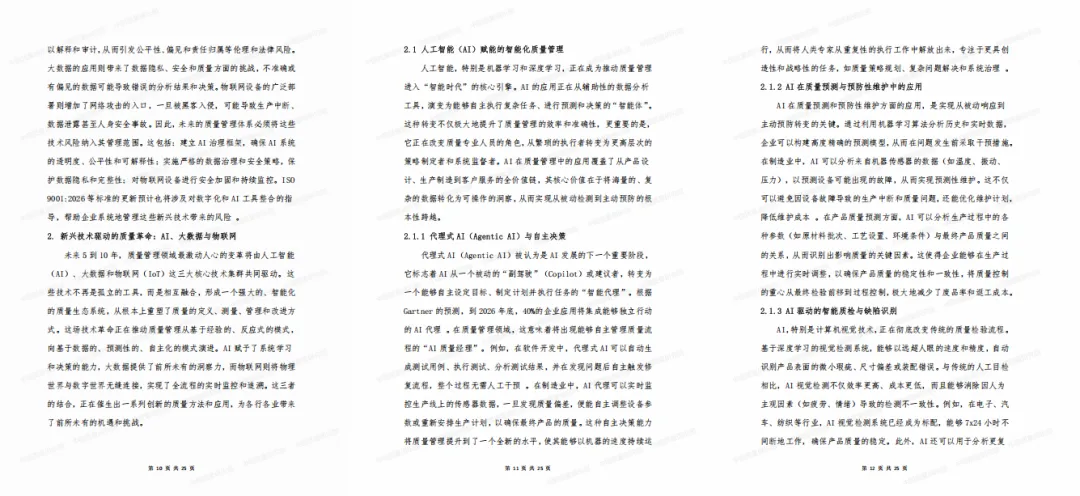 三是新兴技术驱动的智能化革命,人工智能(AI)、大数据和物联网(IoT)将共同构建“质量 4.0”新框架,实现从被动检测到主动预测、从自动化到自主决策的跨越。这场变革将系统性地重塑制造业、服务业、医疗健康、教育及政府公共管理等关键行业的质量实践,并催生新的管理理念、标准体系和持续改进模式。