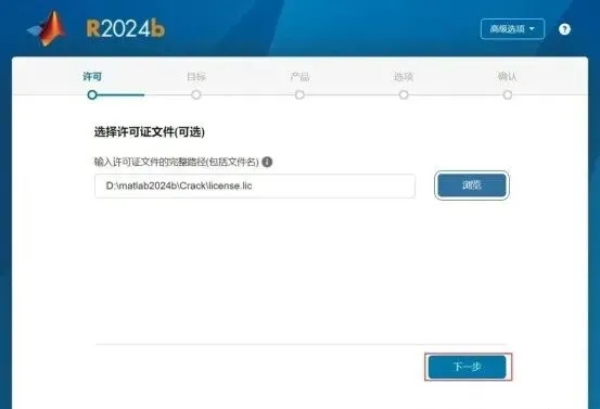 2024b的密钥【39676-02743-14813-63132-22122-21739-42724-01237-08353-51560-41813-30272-46436-42021-53831-05395-21684-43572-58789-40638-42099-40160-19797-60670-44428-39867】9.选择解压后的【MATLABR2024b(64bit)】文件夹中【Crack】文件夹下的【licese.lic】,点击【打开】。