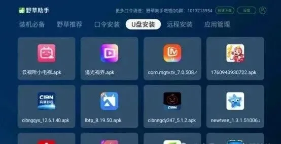 在电视上安装野草助手后,只需打开应用并输入4位专属口令,即可一键直达目标应用并快速下载。