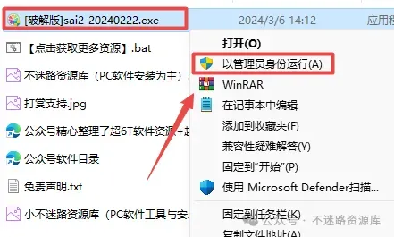2.打开刚刚解压的文件夹,鼠标右键点击“[破解版]sai2-20230711.exe”选择“以管理员身份运行”