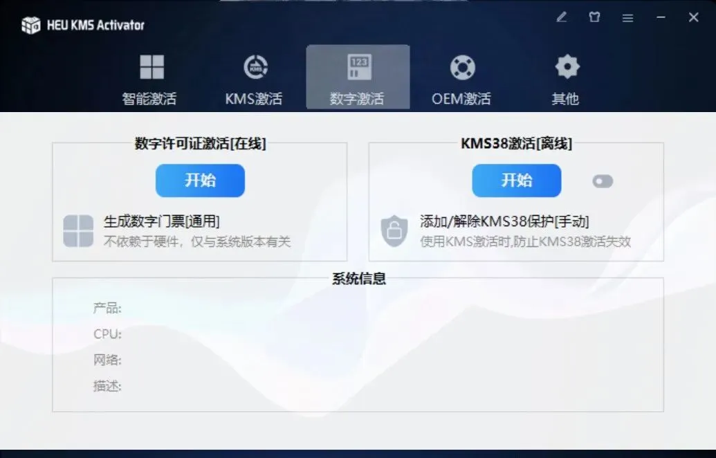 查看当前系统信息:网络状态/激活状态,描述便于快速查看是否支持数字许可证/KMS38