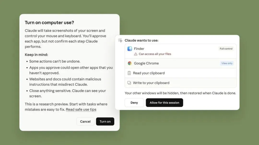 只在关键节点再回来向你确认(比如 Claude 需要访问一个新的应用时会问你一声,但不会每点一下鼠标都来问你)