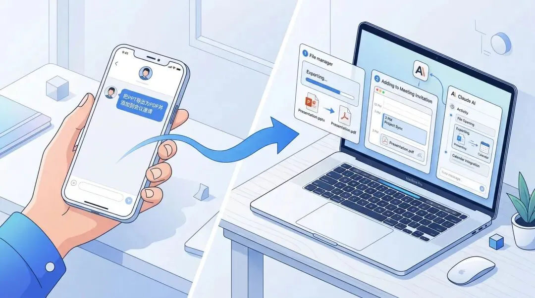Anthropic 在官方演示中展示了这样一个场景:用户正赶去开会,来不及坐到电脑前,于是用手机告诉 Claude“把 PPT 导出为 PDF,然后附到会议邀请里”。Claude 在 Mac 上自动打开文件、完成导出、找到日历事件、上传附件——全程无需人工干预。citationcitation