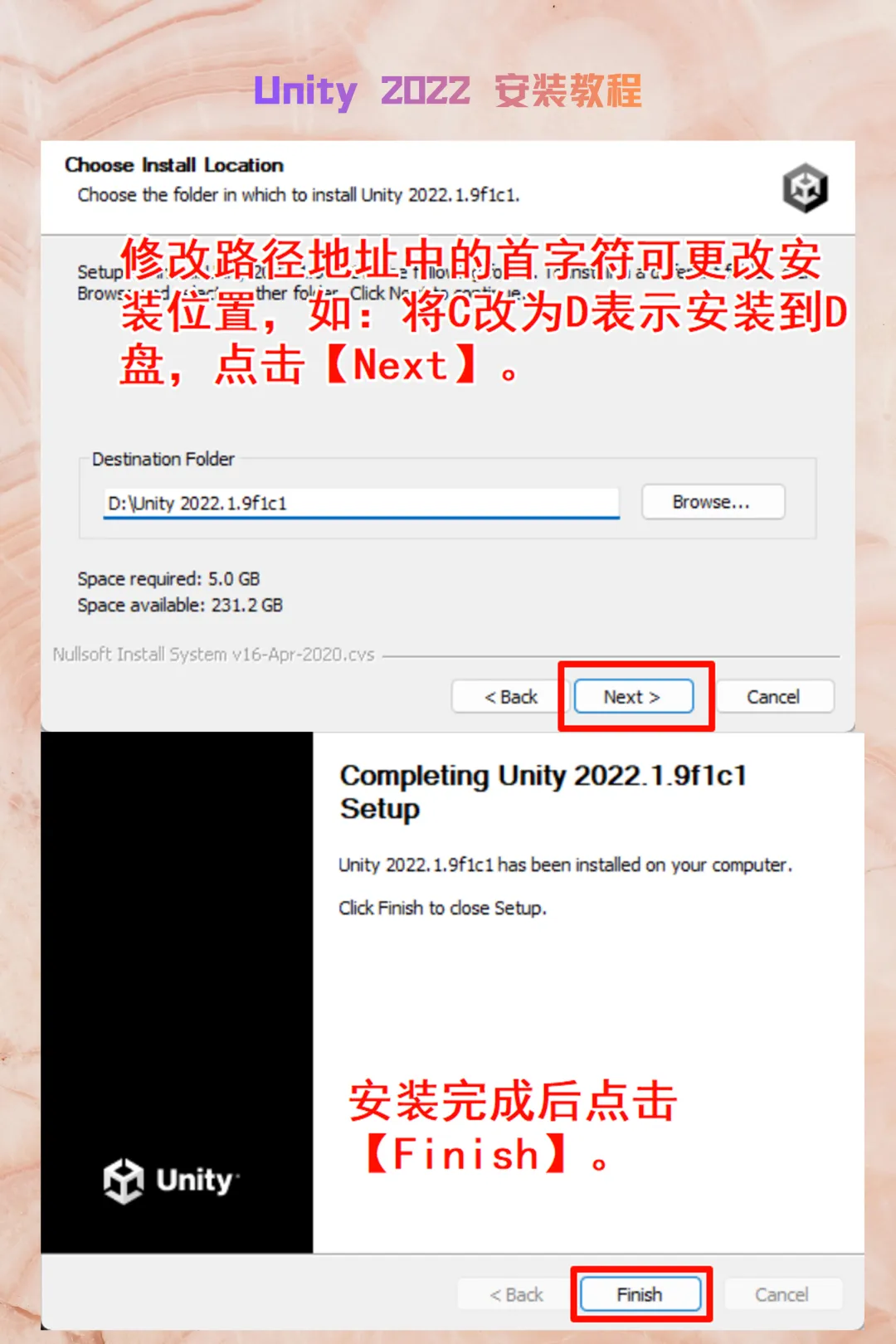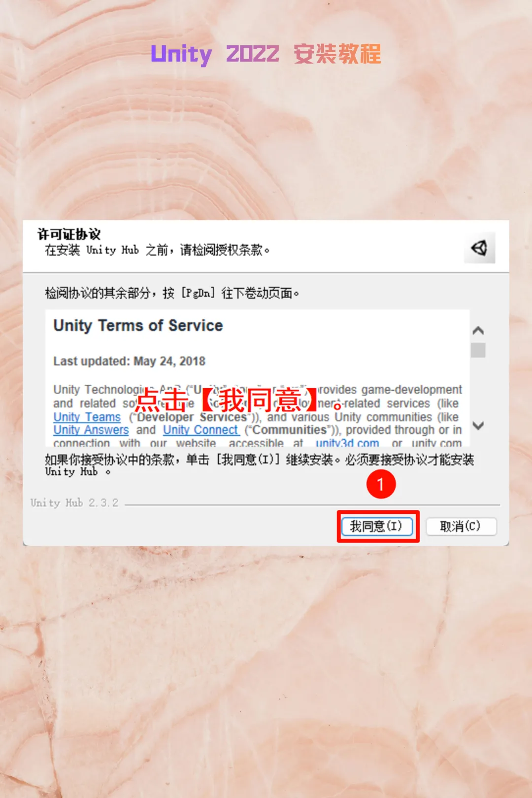 2. 安装 Unity Hub:右键点击UnityHubSetup选择【以管理员身份运行】。点击“我同意”,修改安装路径(如 C 改为 D 盘)。