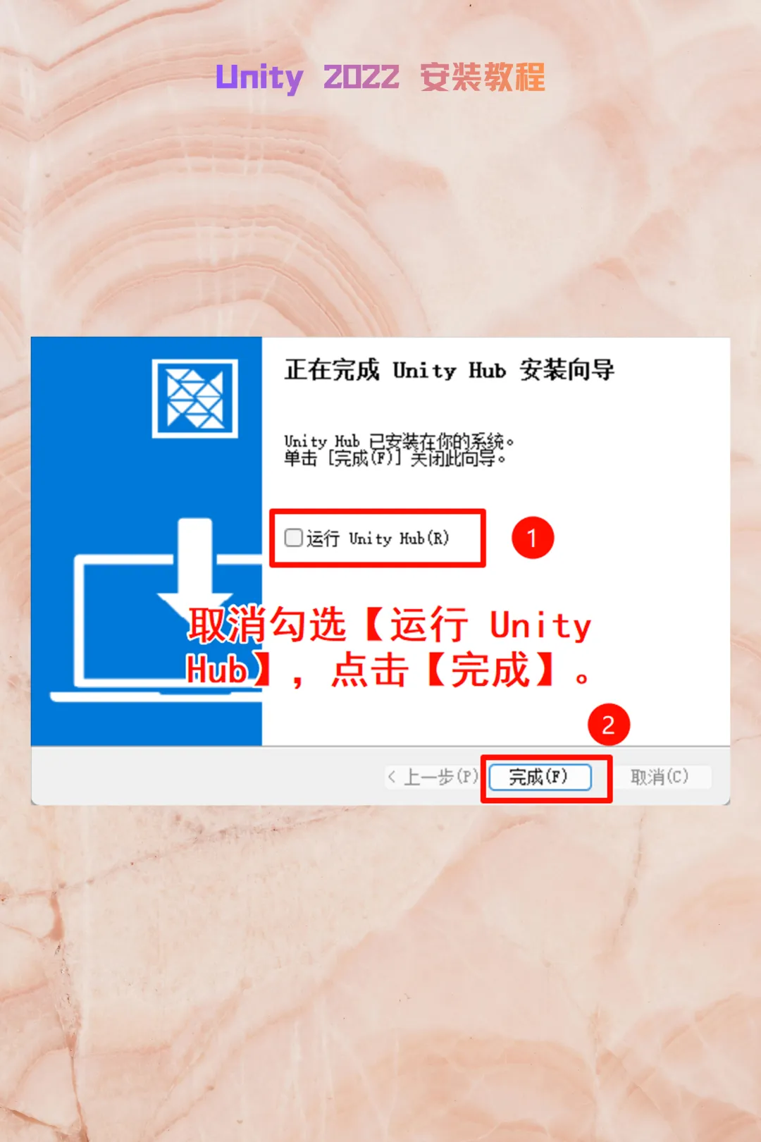 ⚠️ 核心避坑:安装完成后,务必取消勾选【运行 Unity Hub】,然后点击【完成】。
