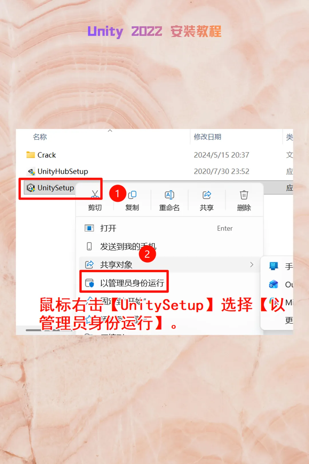 1. 权限启动:右键点击UnitySetup,选择【以管理员身份运行】。