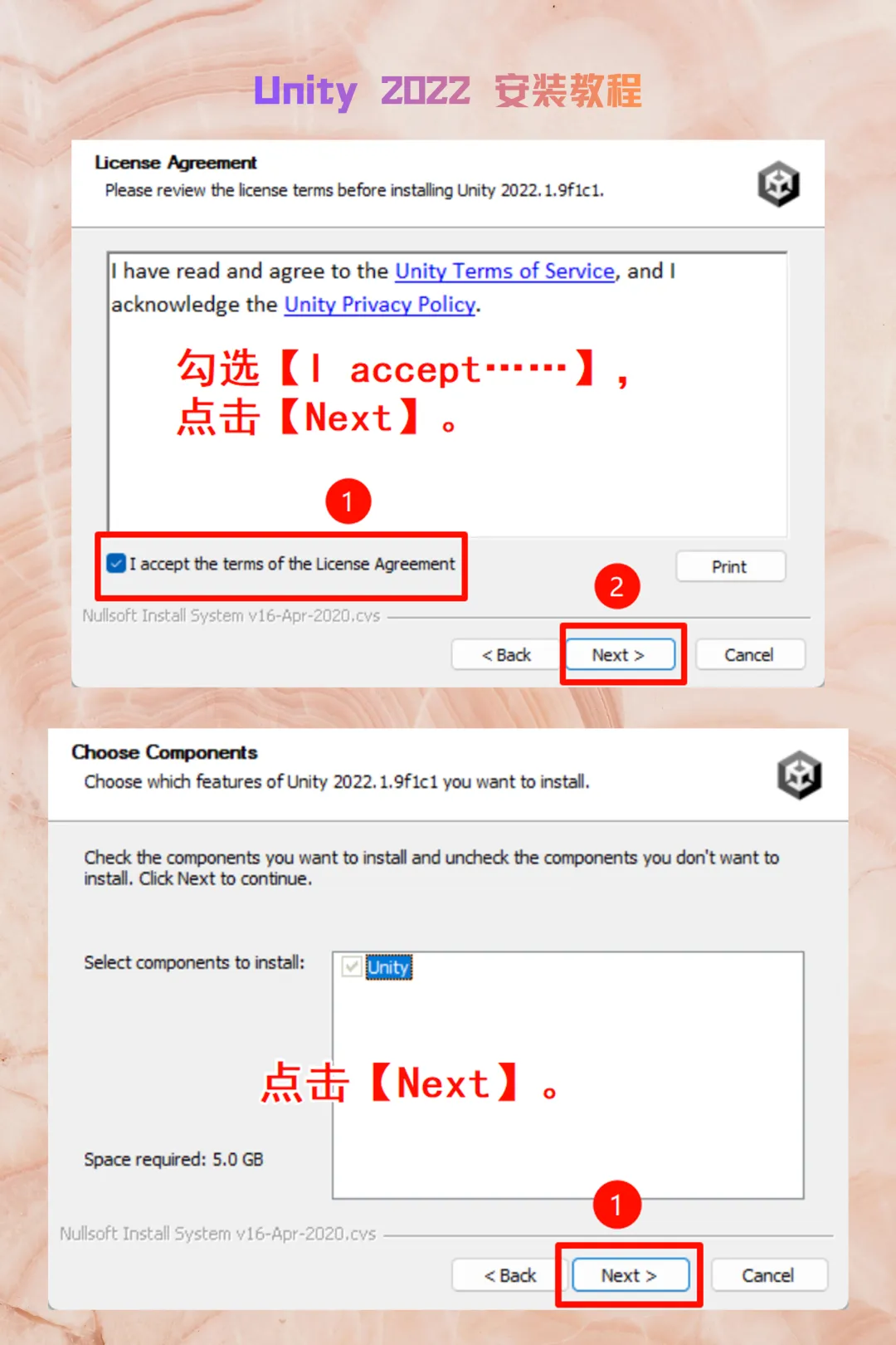 3. 组件与路径:保持默认 Unity 核心组件勾选,点击 Next。修改安装路径至非系统盘,继续点击 Next。