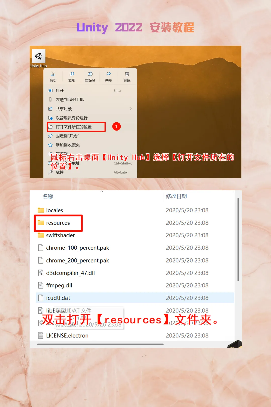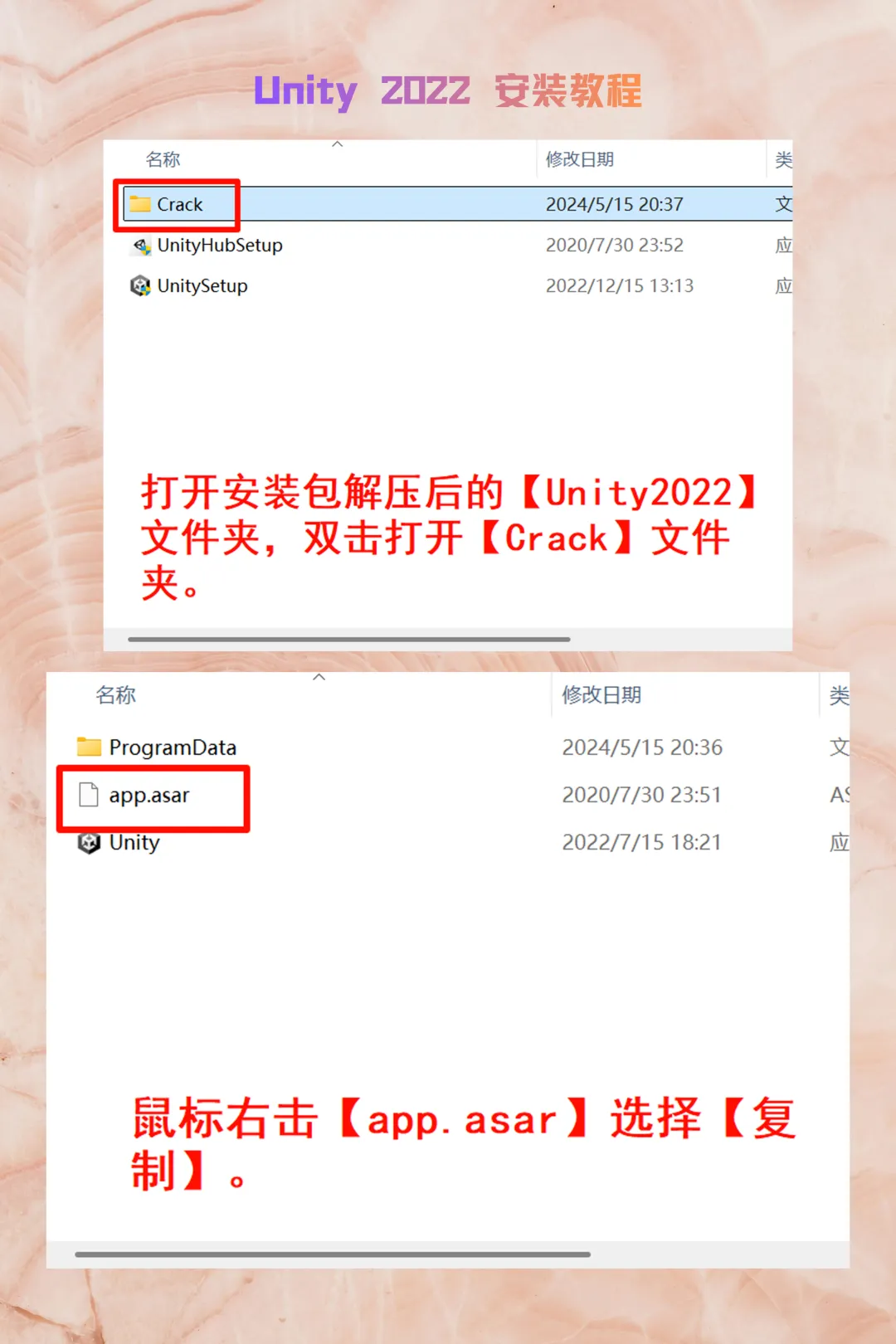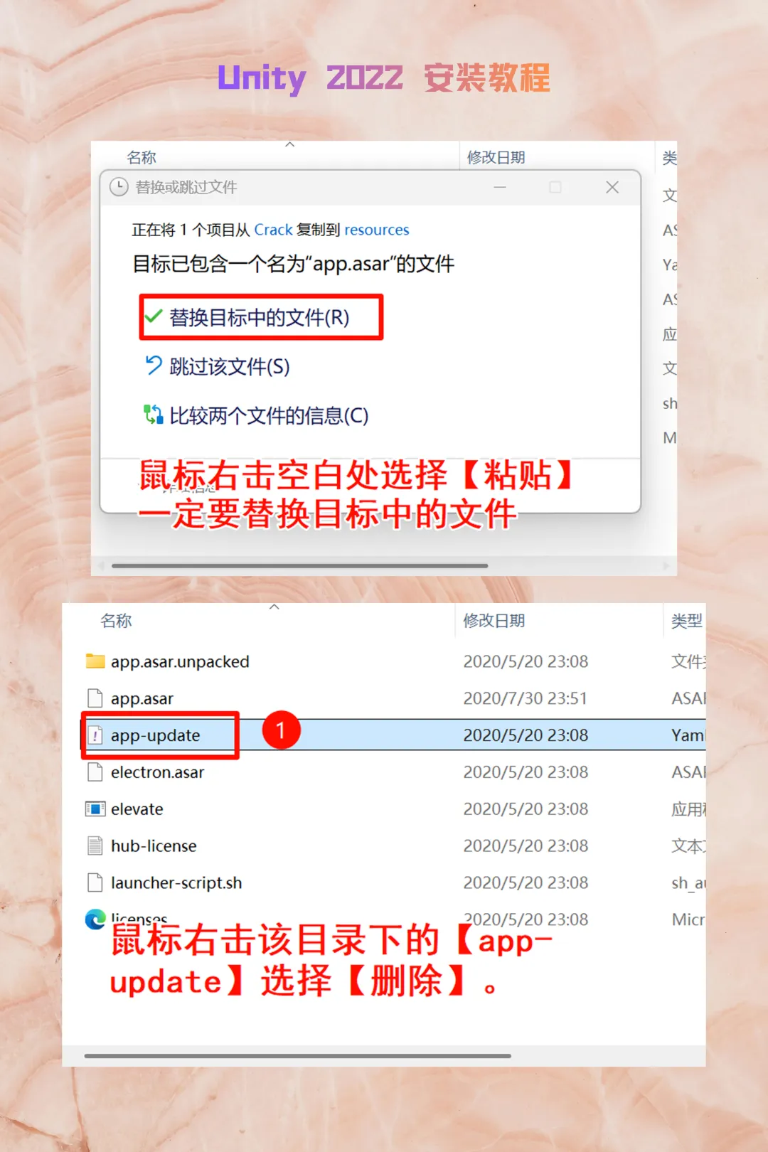 复制 Crack 文件夹内的app.asar。右键桌面Unity Hub图标 ->【打开文件所在的位置】 ->进入resources文件夹 ->粘贴并替换。同时在同级目录下手动删除 app-update 文件。