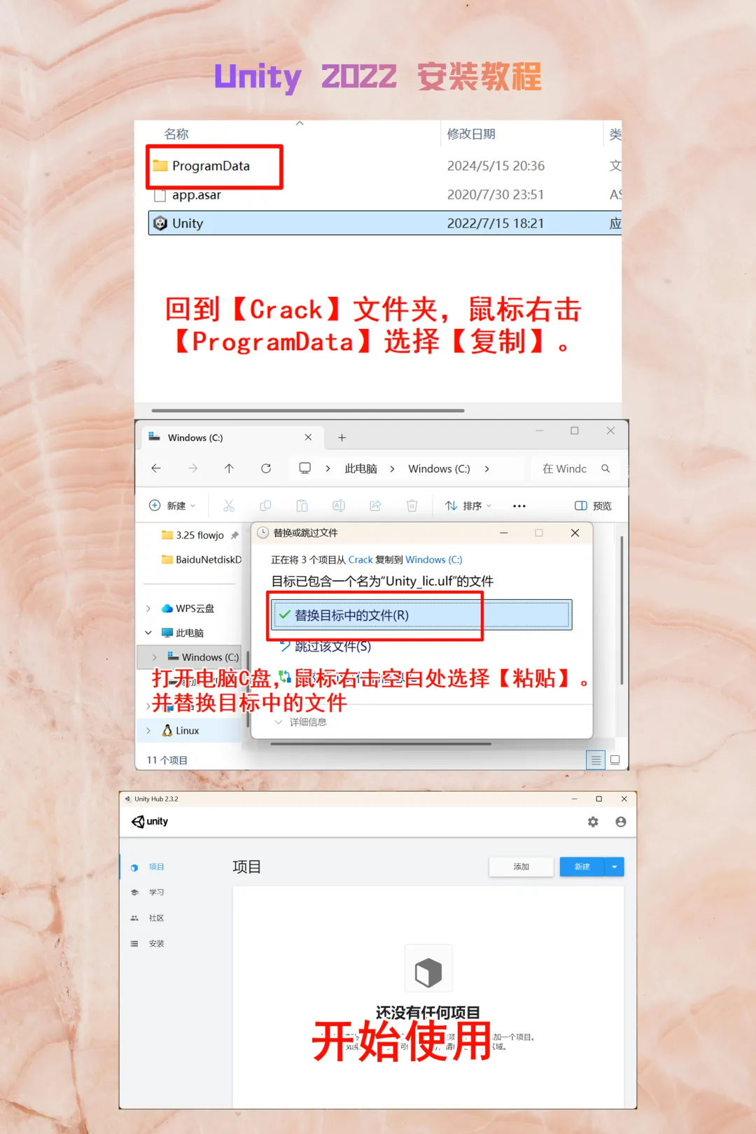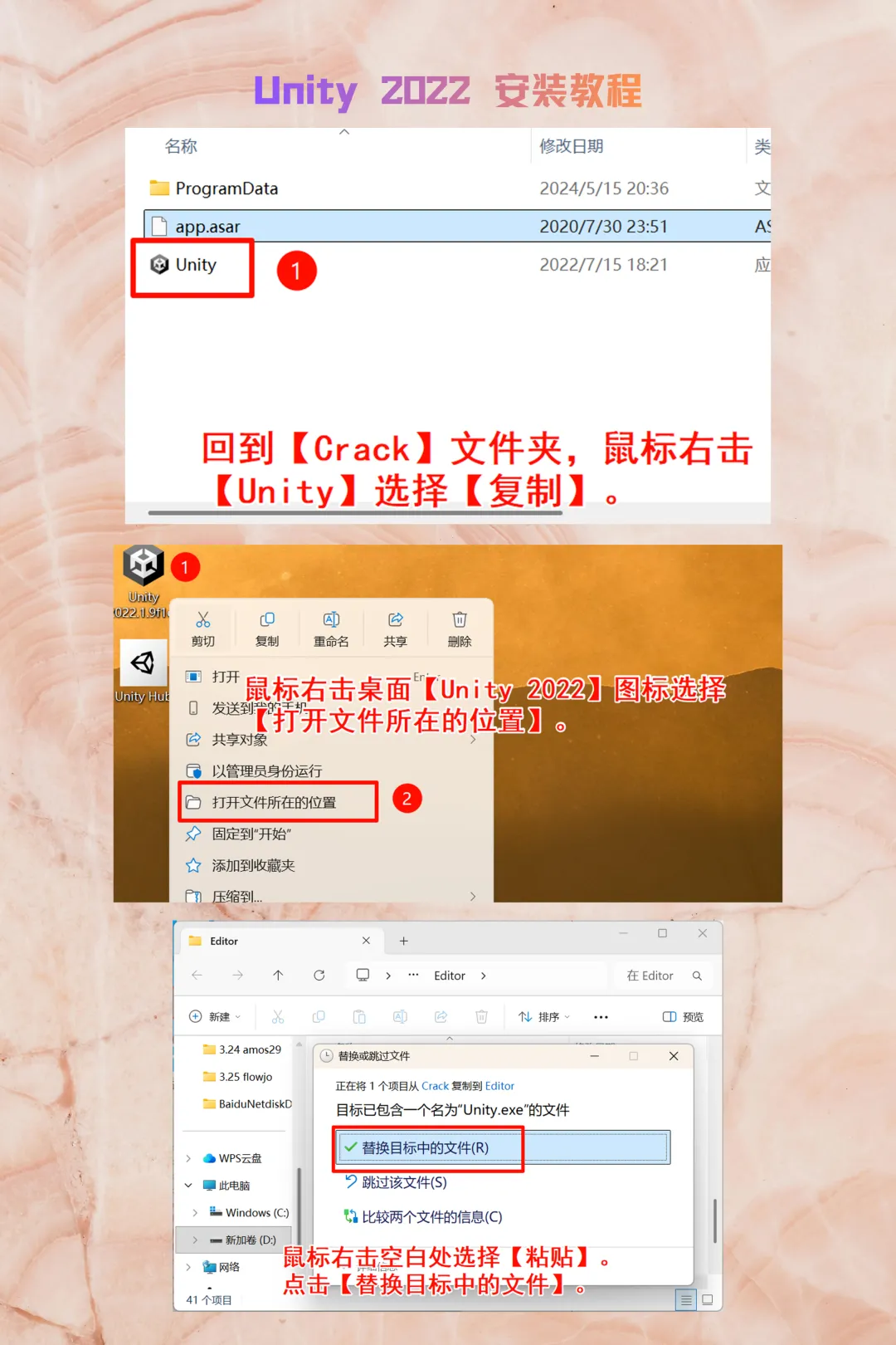 回到 Crack 文件夹,复制Unity执行文件。右键桌面Unity 2022图标 ->【打开文件所在的位置】 ->在根目录下粘贴并替换。