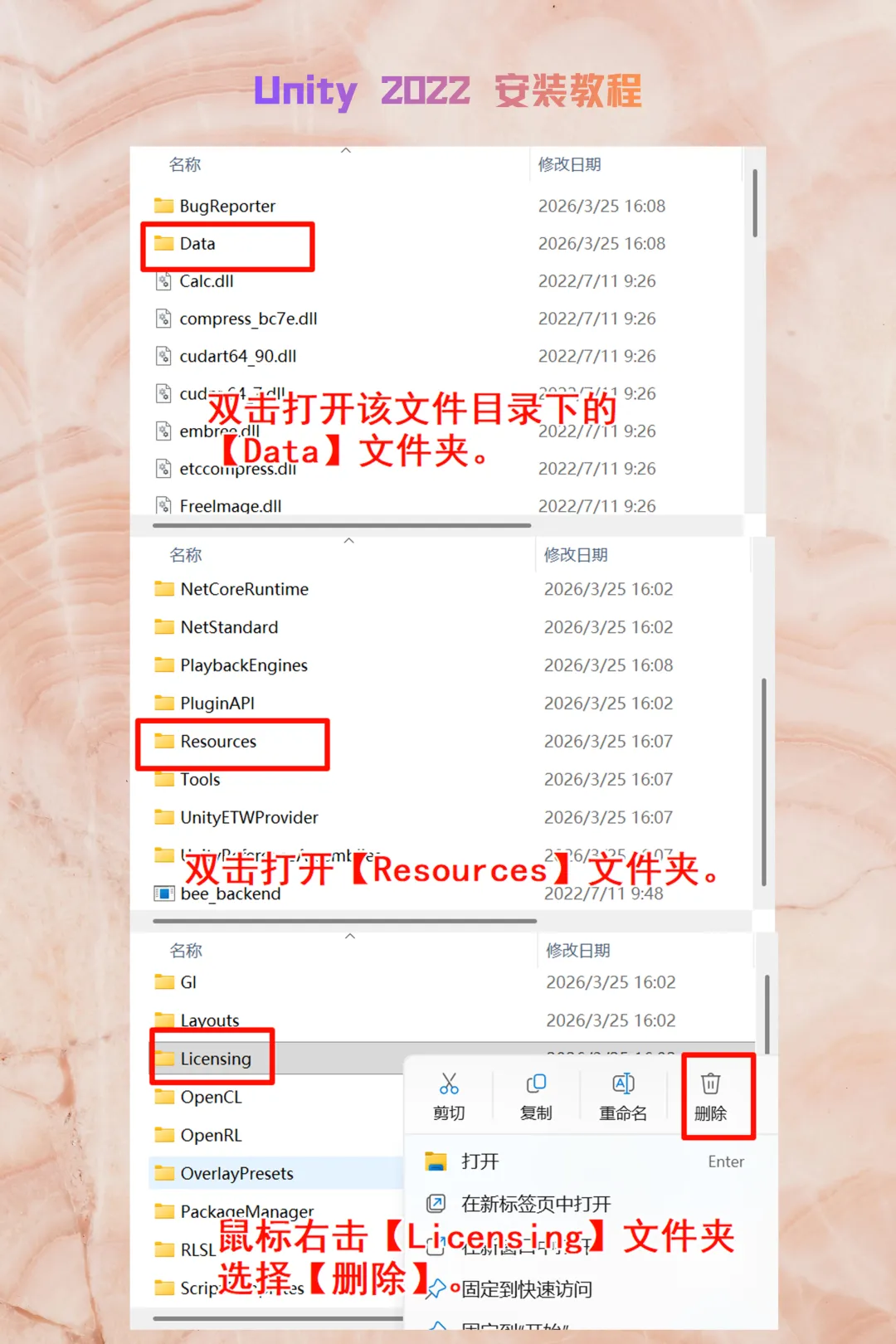 进入 Unity 编辑器安装目录下的Data->Resources文件夹。找到并直接删除【Licensing】文件夹。