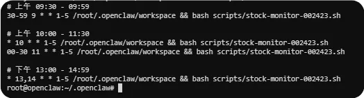 工作日9:30~11:30,13:00~15:00,每分钟监听A股 xxxx 股票价格,一次价格变动超过1%时发消息提醒我。因为调用比较频繁,而且只查询单只股票价格,然后它自己写了一个脚本,通过qt.gtimg.cn接口获取数据,然后判断变动是否超过1%,再用脚本推送到聊天窗口。不经过agent,也不消耗模型token。然后它还创建了系统cron定时任务。