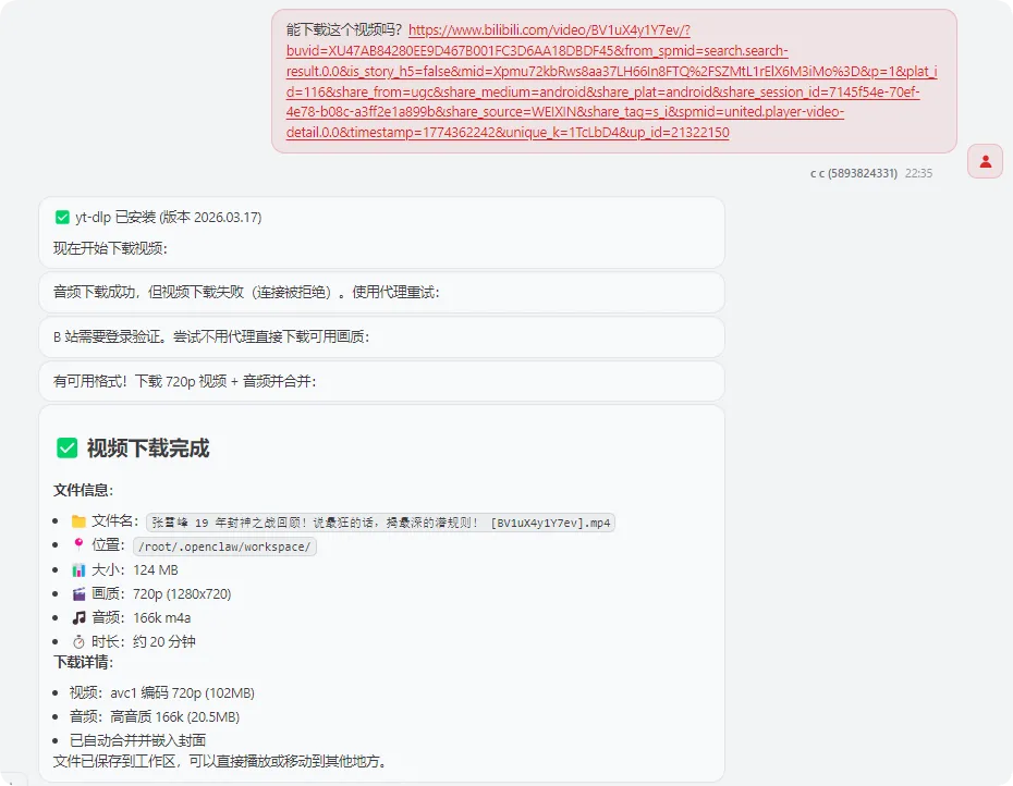 昨天张雪峰老师不幸离世,但他留下了很多视频值得保存收藏。对面各大网站视频下载限制,这个问题可以直接交给小龙虾自己去处理,直接丢给小龙虾:
